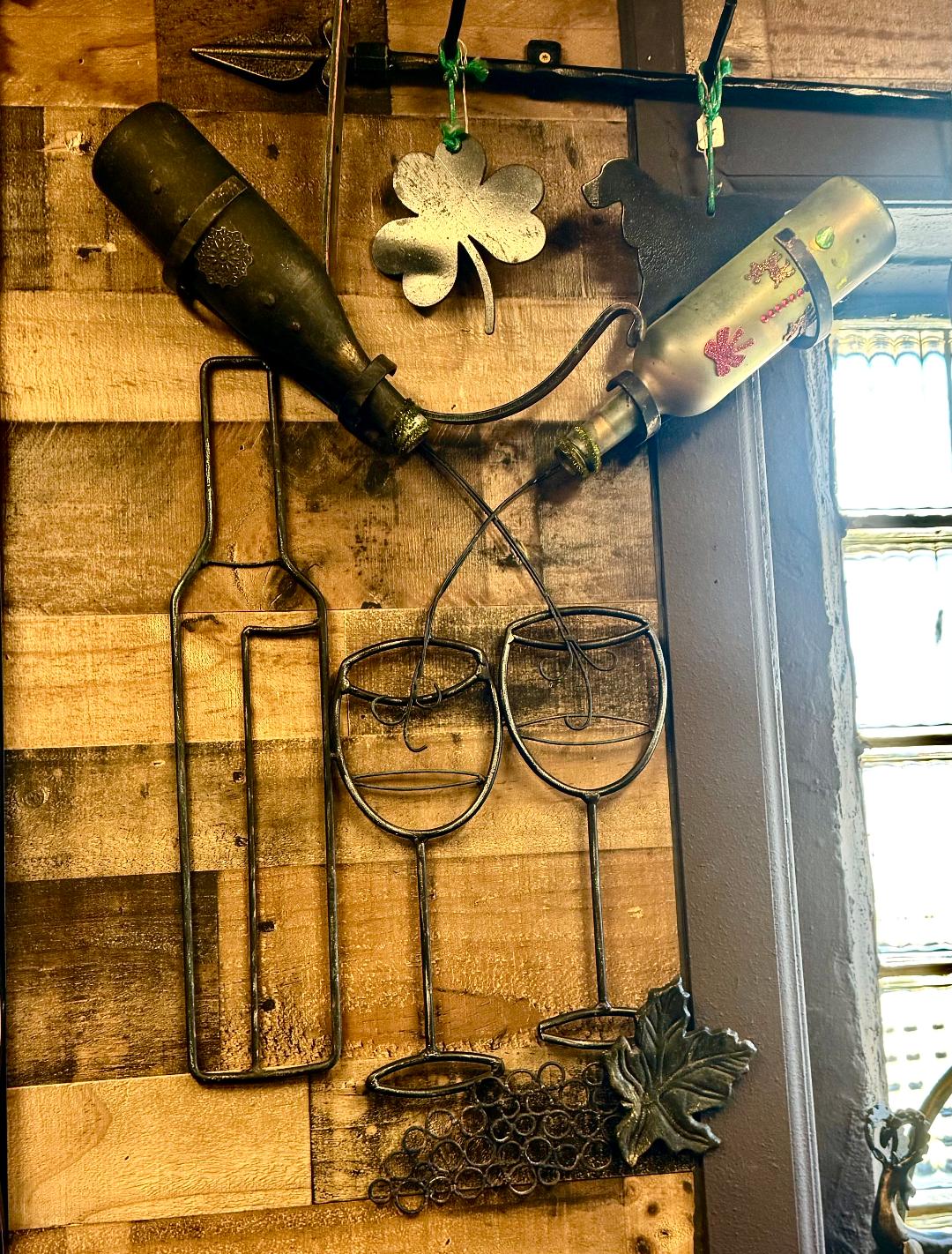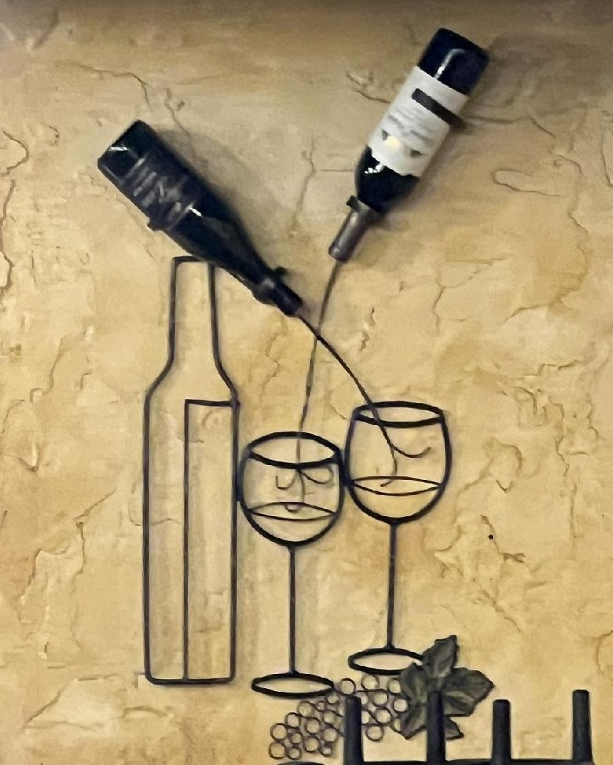 Metal wine racks with artistic designs, showcasing two wine glasses, grape clusters, and a holder for two bottles.